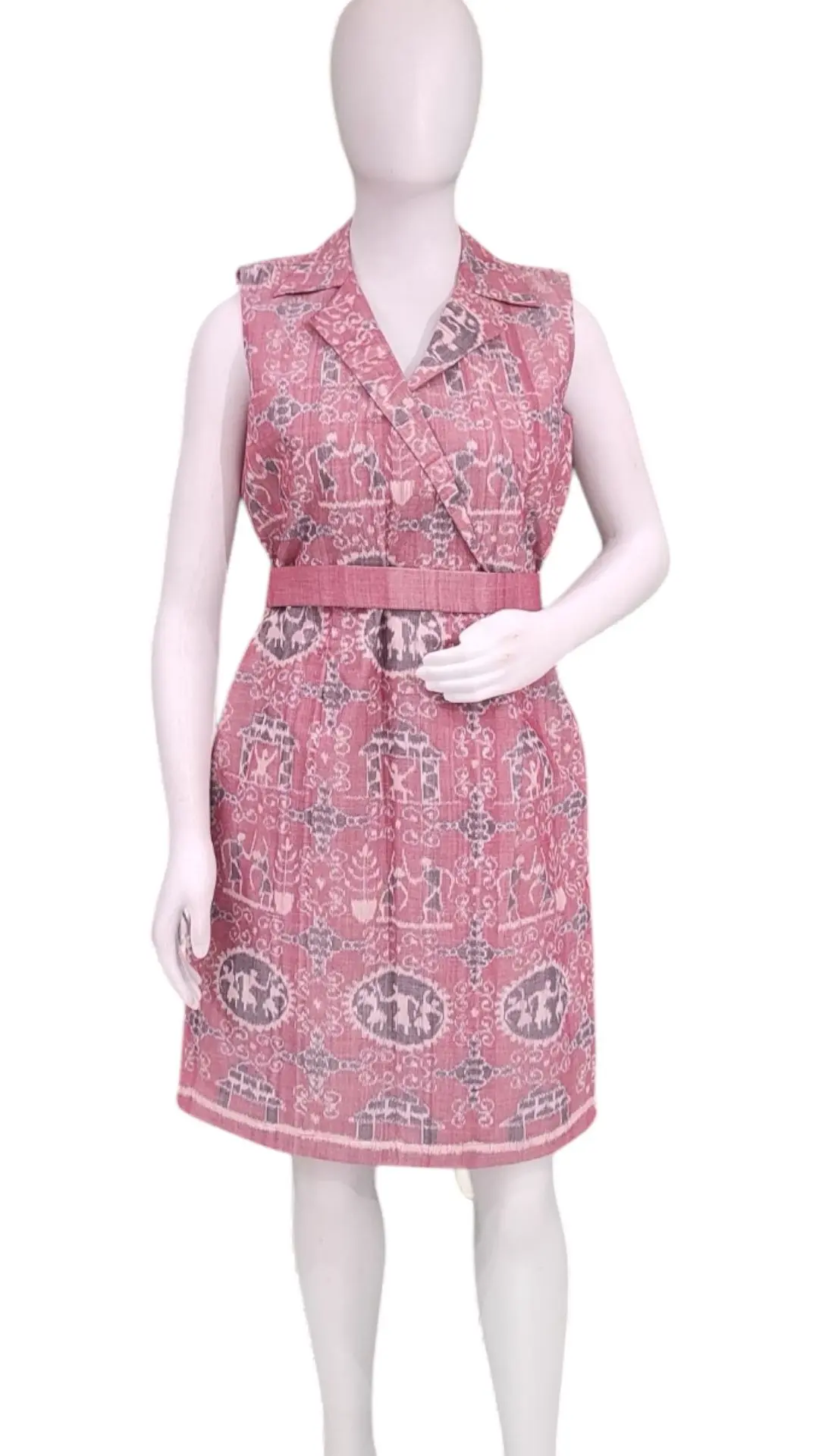 Crafted from authentic Sambalpuri handloom fabric, this sleeveless dress showcases the intricate ikat patterns that Odisha?s weaving heritage is celebrated for.