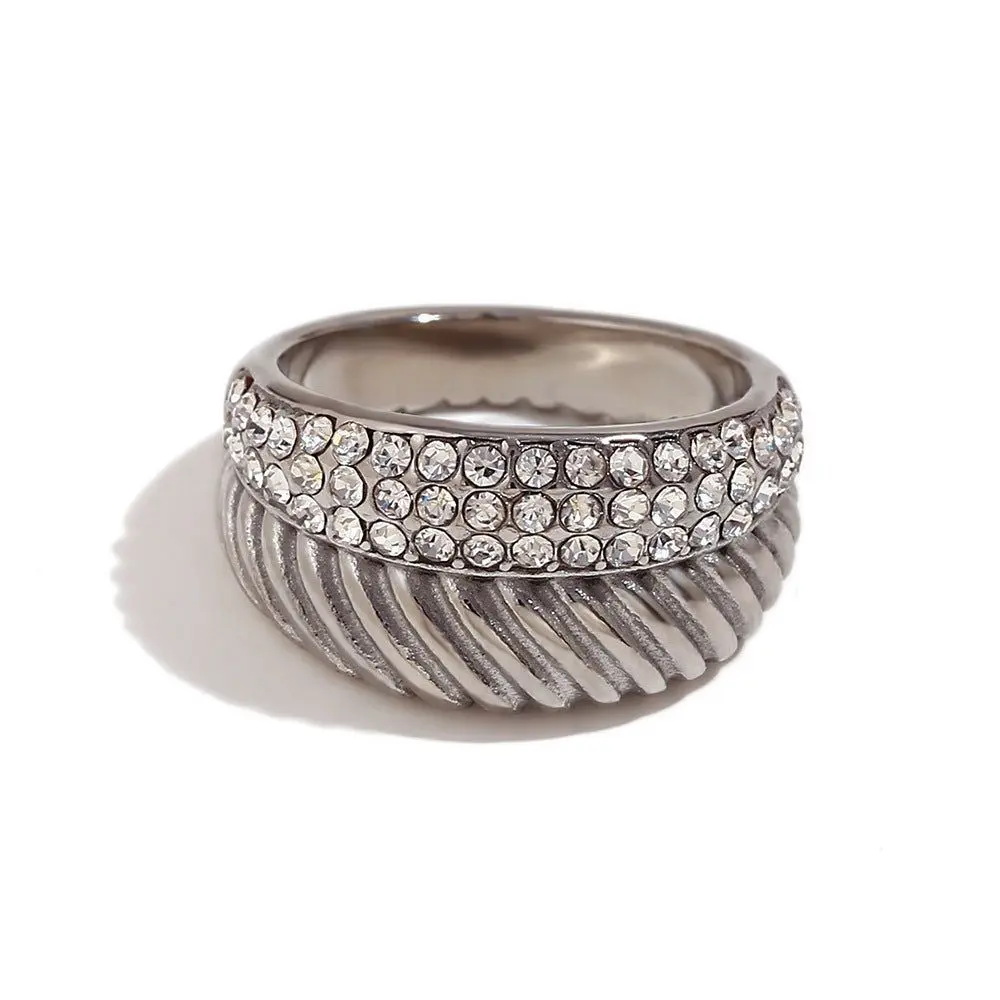 This silver-toned ring features a dual-design: a band of shimmering, pave-set crystals on top and a ridged, rope-like texture beneath, creating a dynamic contrast of glamour and grit. Its chunky, contemporary silhouette is perfect for elevating casual outfits or adding a touch of drama to evening wear. Crafted for those who love standout accessories with a touch?of?elegance.