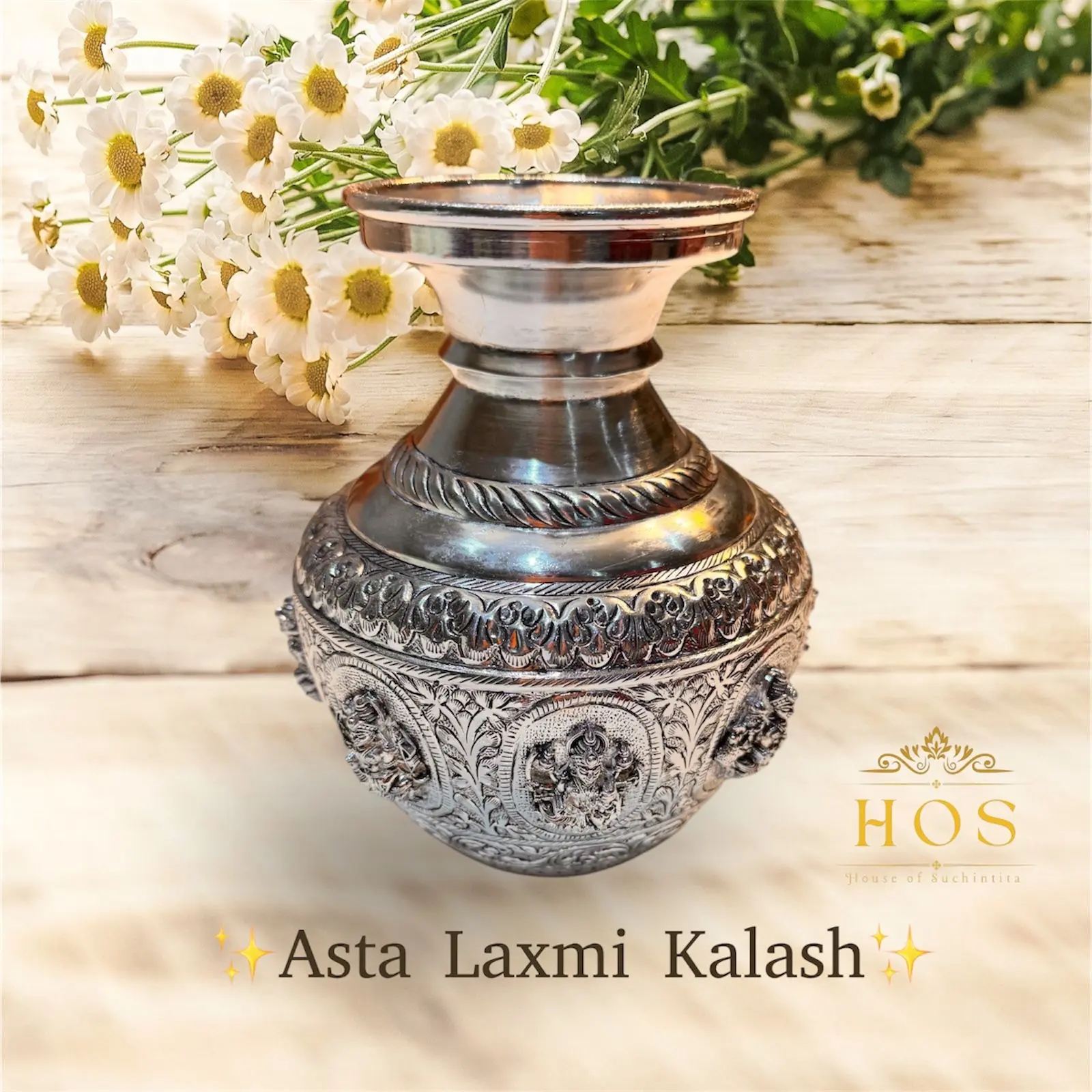 Handcrafted in pure or silver-plated metal, each form of Lakshmi is intricately engraved around the kalash, making it a powerful centerpiece for poojas, festivals, and religious ceremonies. Whether used in traditional rituals or displayed as a spiritual heirloom, this kalash invites blessings, beauty, and serenity into any sacred space.