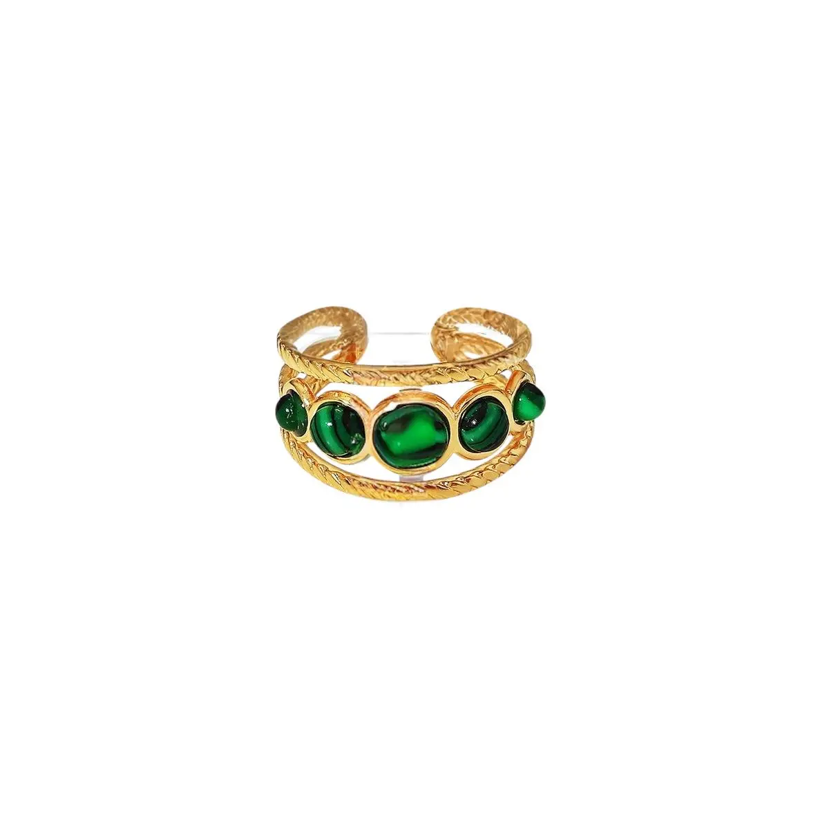 Set in a rich gold-tone frame, the open band features intricate rope-textured detailing and is adorned with five deep green enamel stones arranged in graduating sizes. The combination of vivid emerald hues and ornate metalwork gives this piece an antique-inspired, statement-worthy look. Adjustable for comfort, it?s perfect for adding a touch of drama and elegance to?any?ensemble.