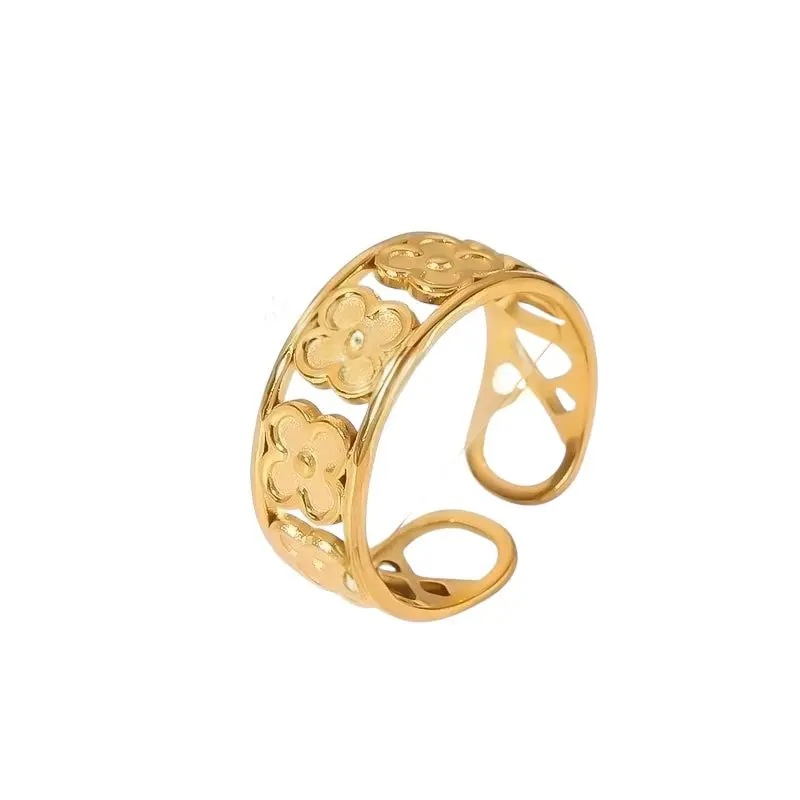 The Golden Floral Cutout Adjustable Ring brings a touch of nature-inspired elegance to your style. Crafted in a radiant gold-tone finish, it features a continuous pattern of delicately detailed flowers with openwork spaces, creating a light and airy feel. The adjustable band ensures a comfortable fit, making it perfect for daily wear or as a charming accent to your special occasion?outfits.