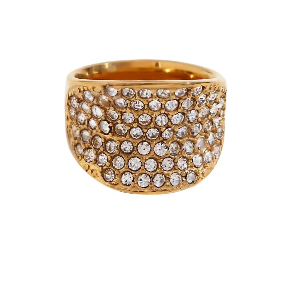 This wide-band ring is fully encrusted with dazzling clear crystals set in a rich gold-tone base, creating a stunning pave effect that sparkles from every angle. Its domed silhouette adds volume and elegance, making it perfect for cocktail parties, evening events, or simply elevating your everyday style. A must-have for lovers of bold statement jewelry with timeless?appeal.