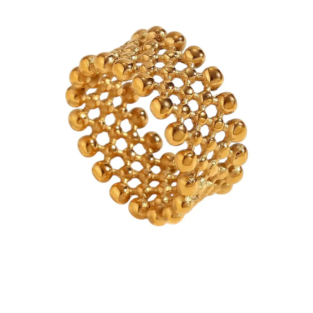 Designed with an openwork honeycomb-like mesh, this wide-band ring features rounded gold beads that create a dimensional, almost sculptural effect. Lightweight yet impactful, it adds a touch of contemporary glamour to any ensemble. Ideal for layering or wearing solo as a statement piece, this ring is perfect for trendsetters who love standout accessories?with?an?edge.