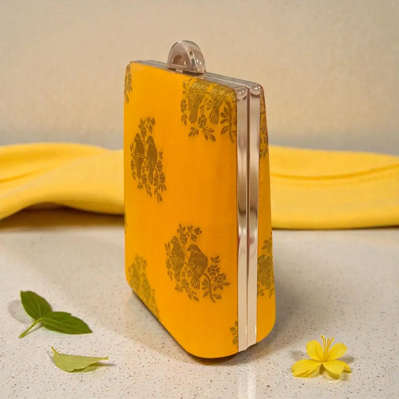 Radiant and refined, the Golden Petal Silk Clutch is crafted from pure silk in a luminous marigold hue, accented with delicate floral motifs in a subtle metallic finish.