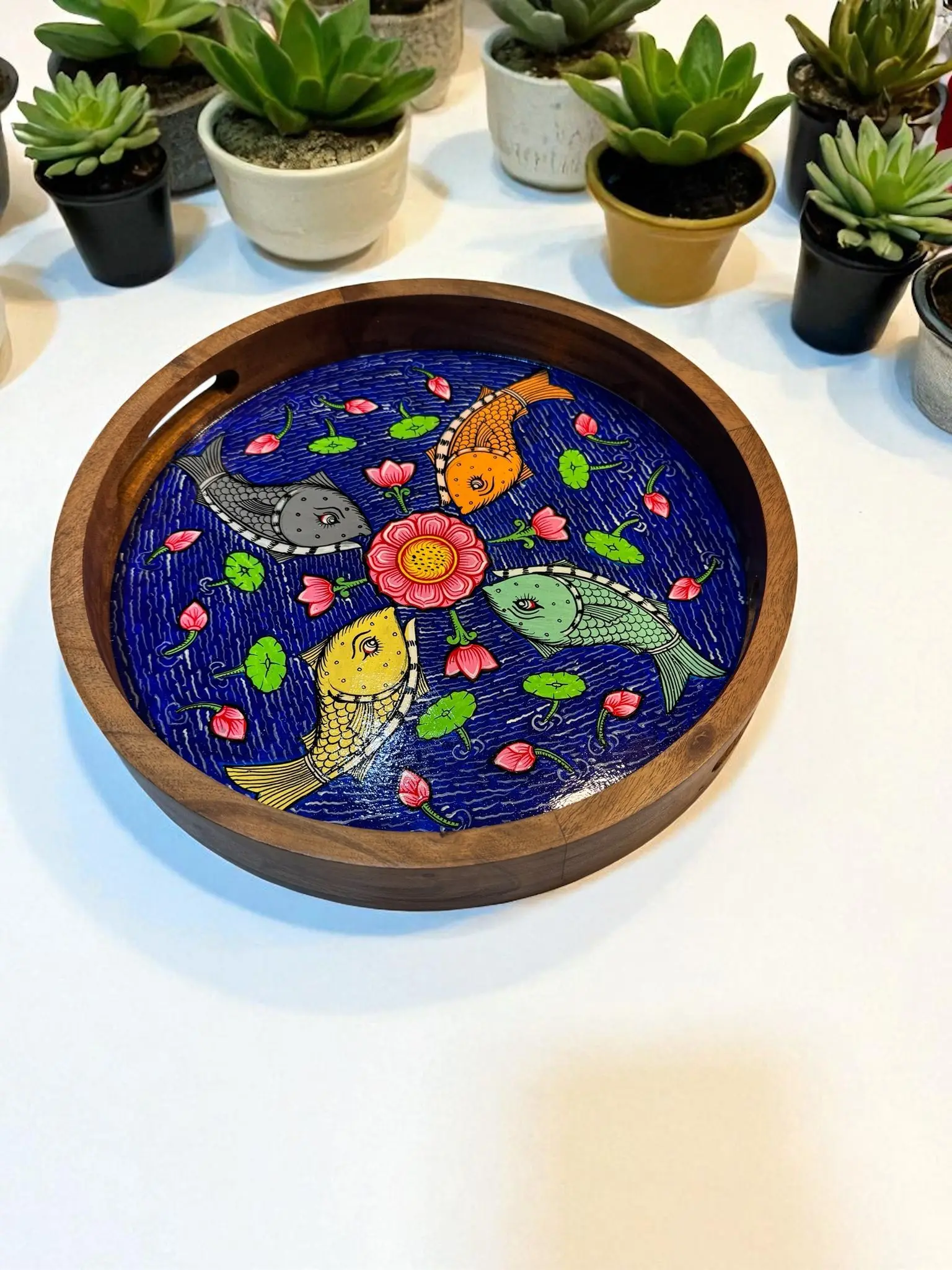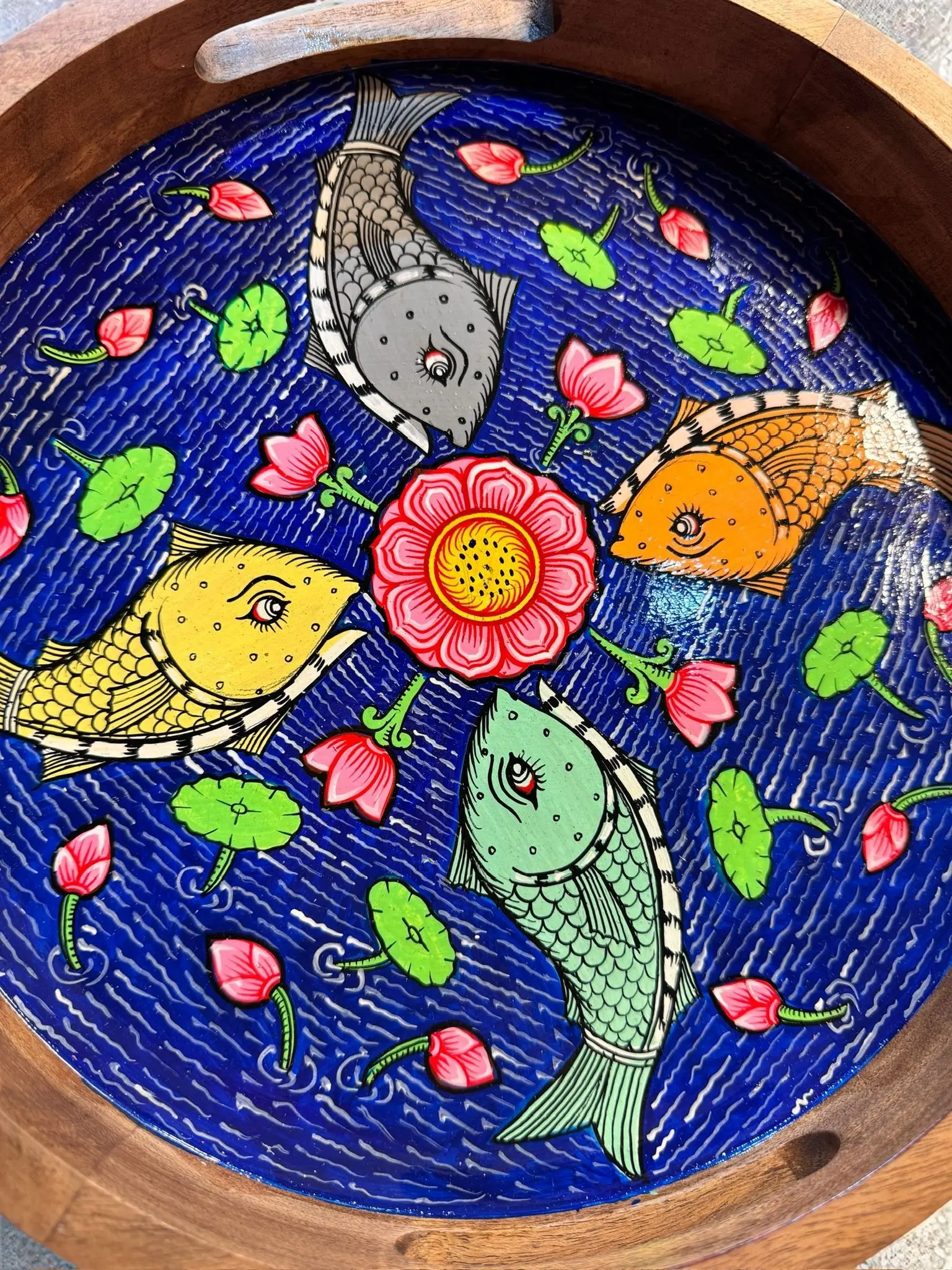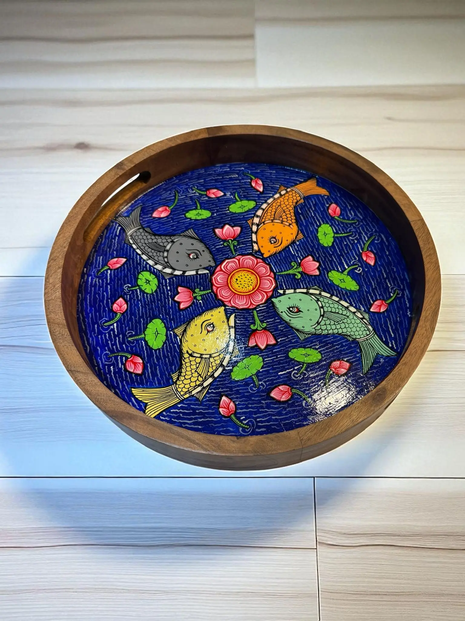 Handcrafted Wooden Pattachitra Tray – Lotus & Fish Motif