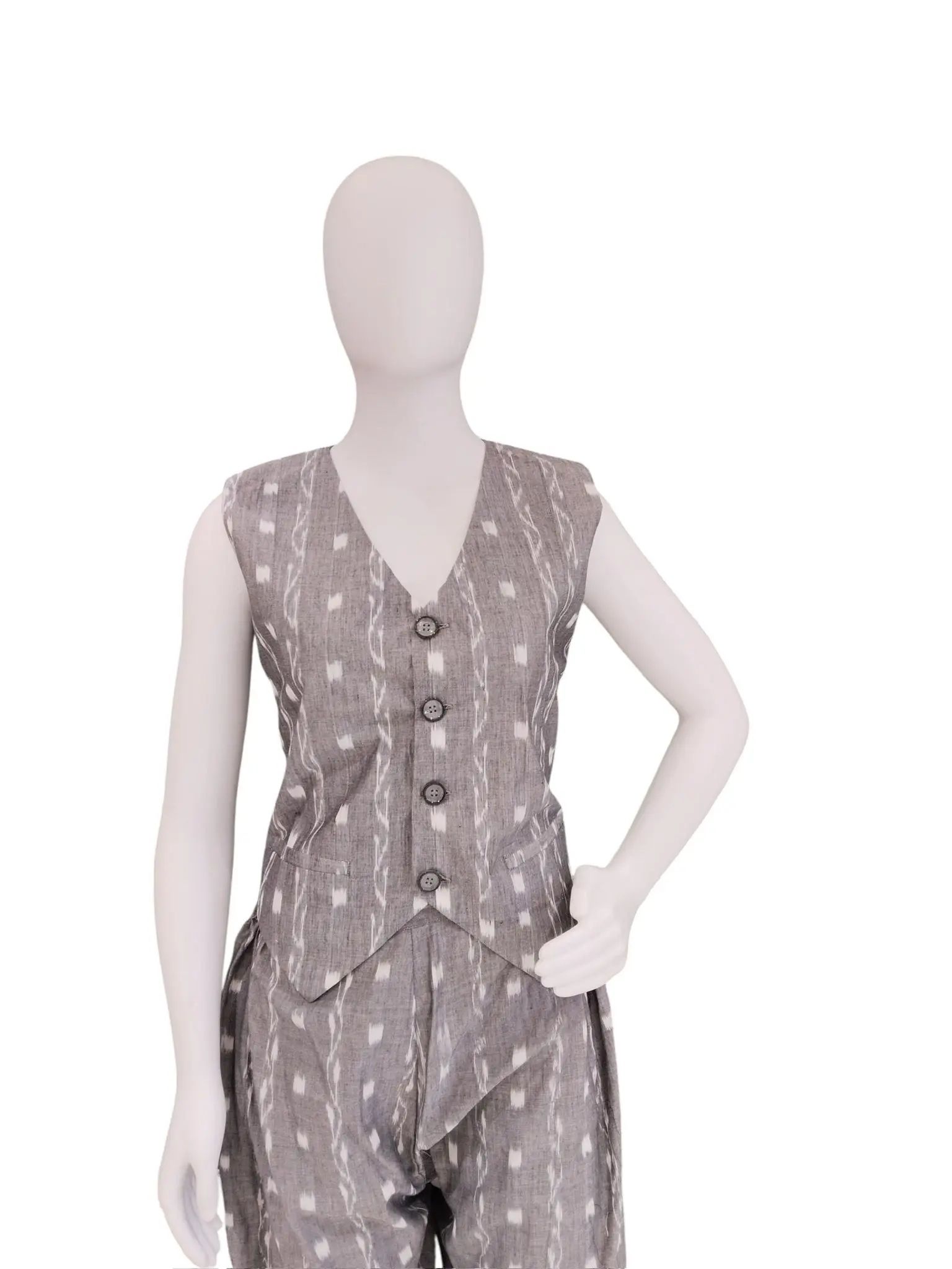 The set features a structured sleeveless button-down waistcoat paired with relaxed-fit trousers, creating a look that is both sharp and comfortable. Whether styled for formal gatherings, casual evenings, or creative workspaces, this outfit redefines handloom fashion for the modern?wardrobe.