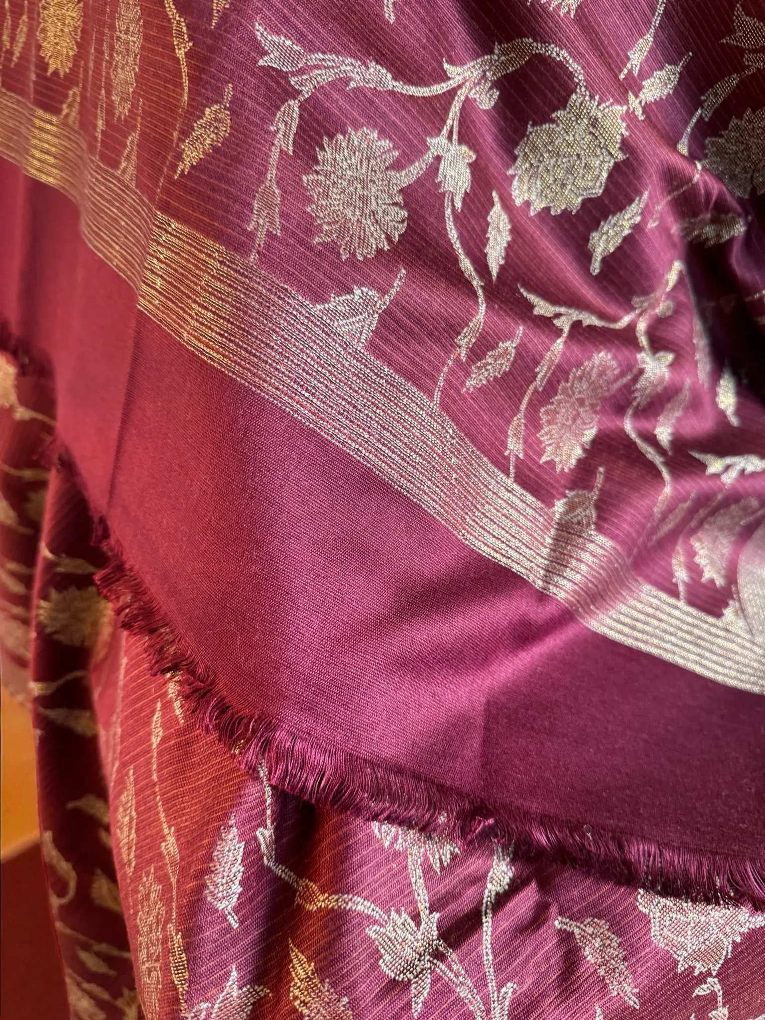 The delicate vine patterns and shimmering border reflect the timeless artistry of Banarasi weaving, blending tradition with sophistication.