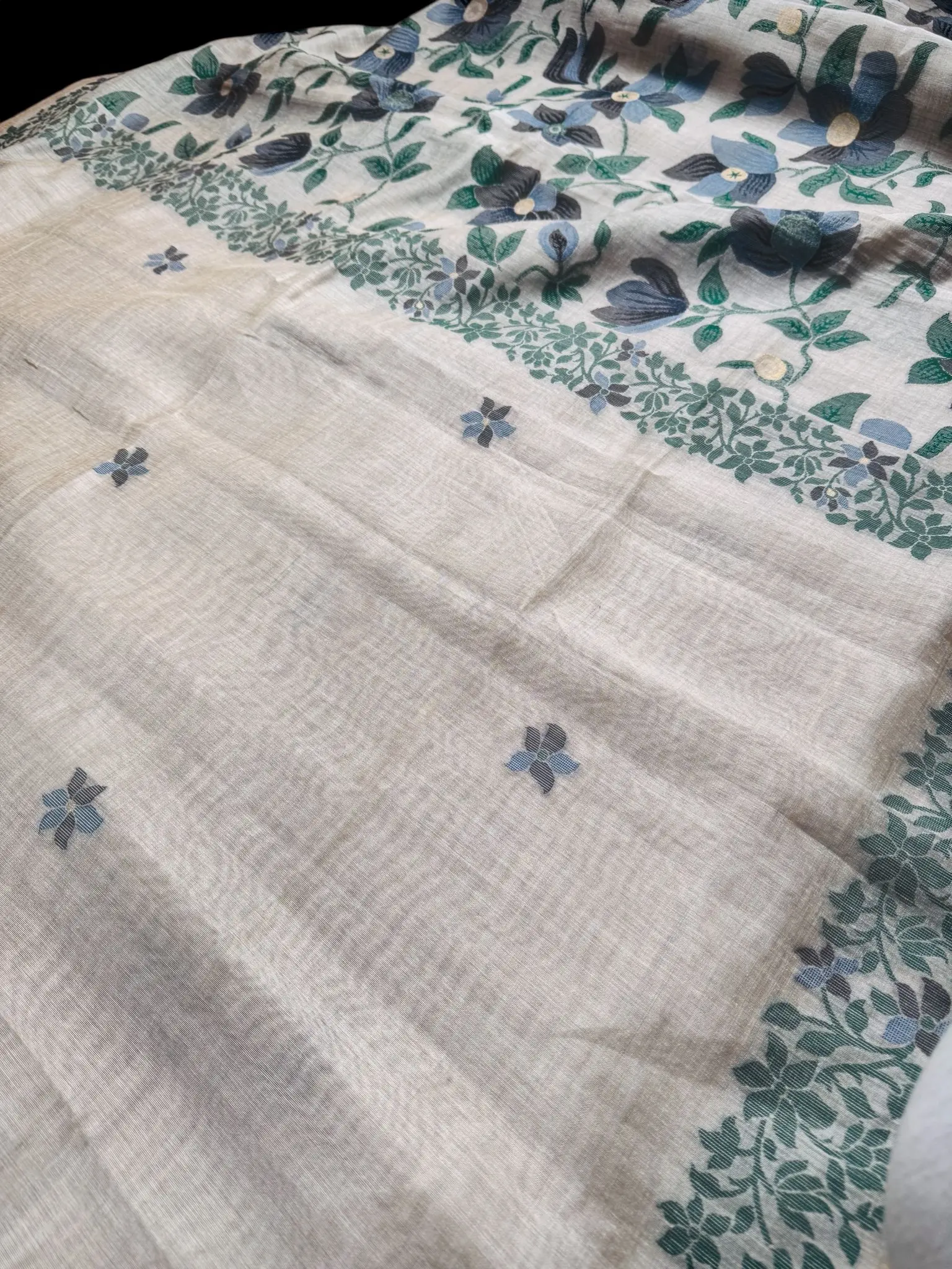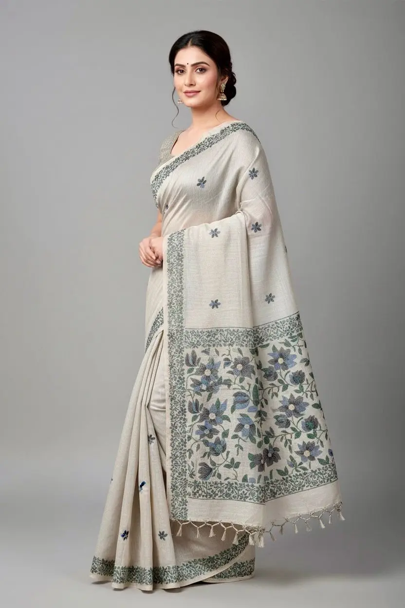 Celebrate timeless craftsmanship with this exquisite handwoven soft Jamdani saree in a serene ivory tone. Meticulously woven by skilled artisans, this saree showcases delicate floral motifs scattered gracefully across the body, complemented by an intricately detailed woven border and a richly adorned pallu featuring elegant botanical patterns.