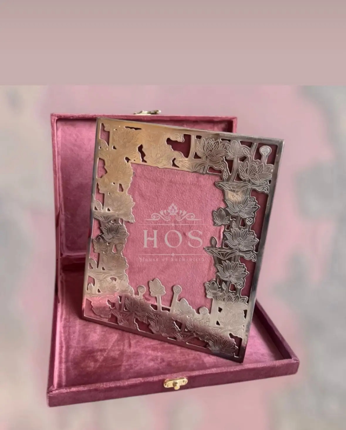 This exquisite frame features an intricate lotus motif delicately etched into a luxurious silver-plated border, symbolizing purity and grace. Presented in a plush, velvet-lined clamshell box in a rich mauve hue, it is perfect for gifting or showcasing cherished moments with sophistication. A perfect blend of artistry and tradition, this frame is a keepsake that adds a refined charm to any decor.