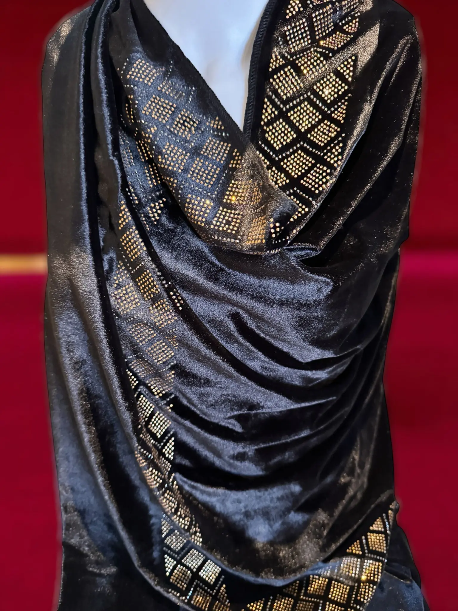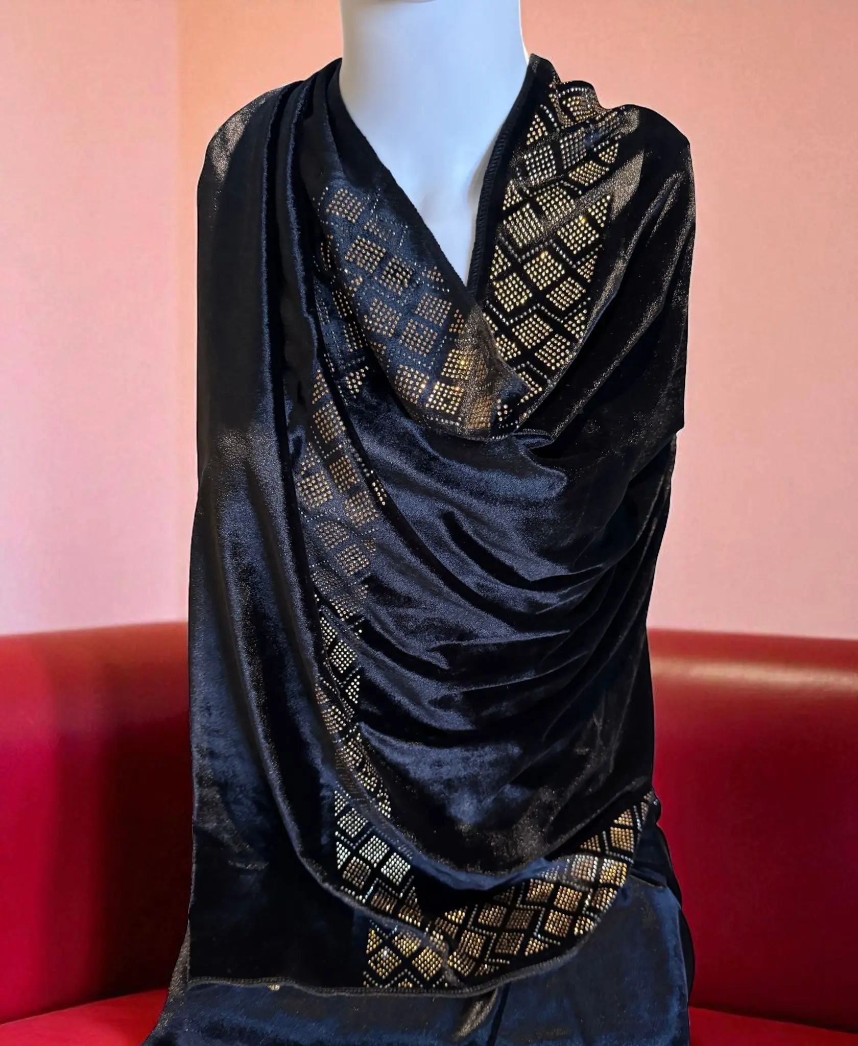 This shawl combines the softness of velvet with the sparkle of embellishment a fusion of comfort and?sophistication.