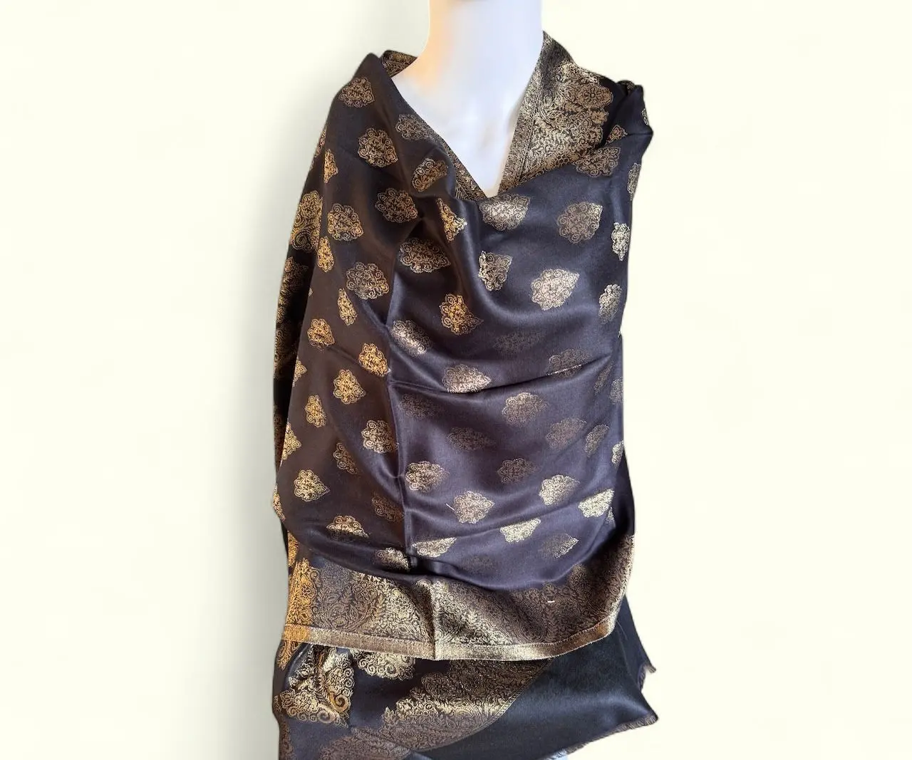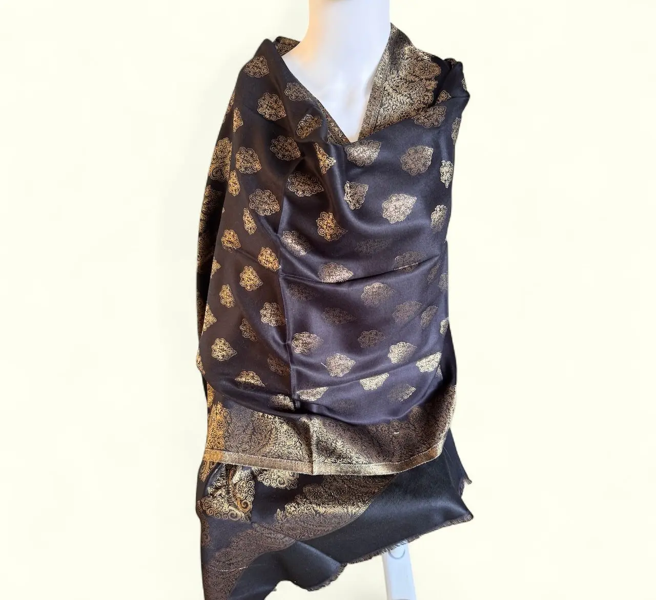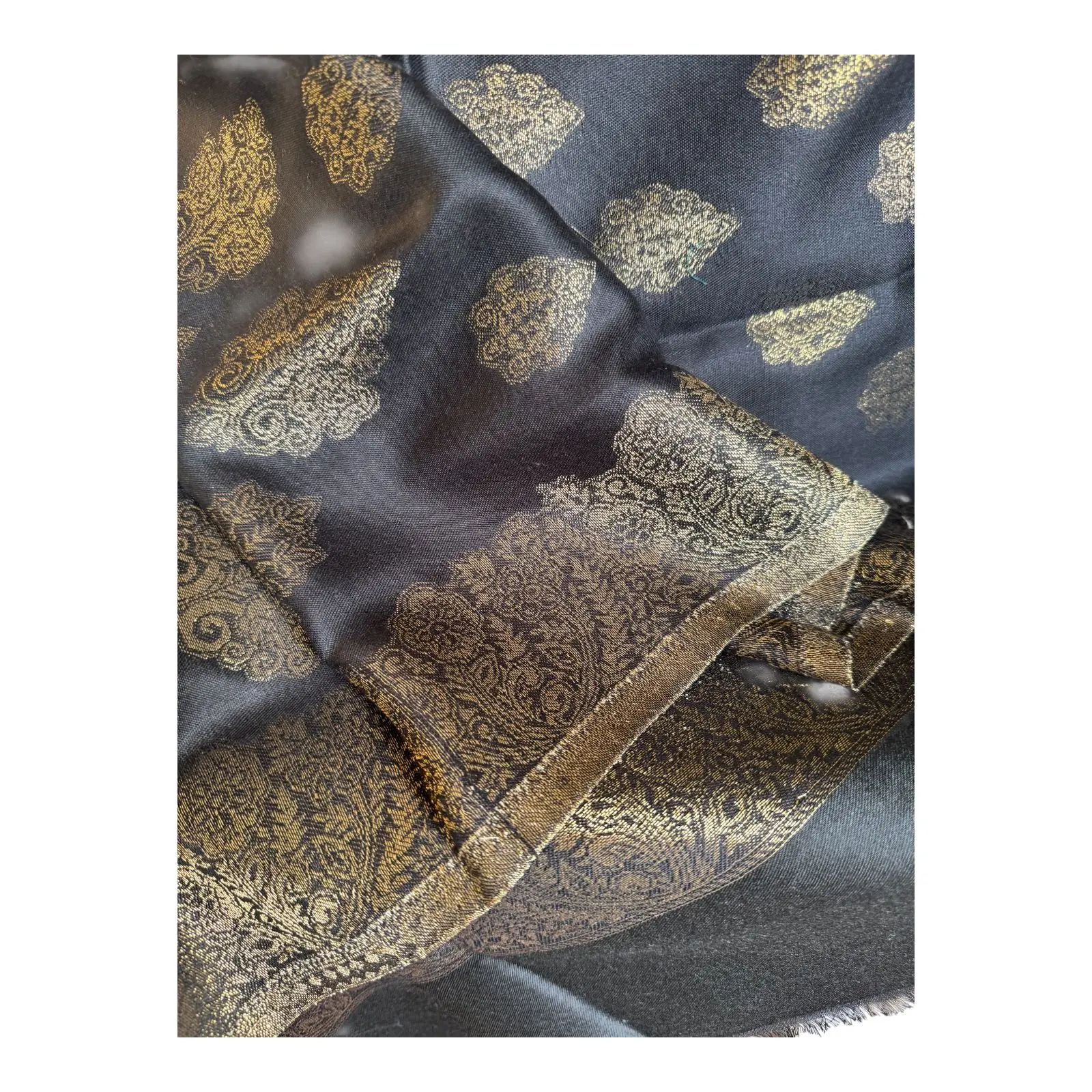 The opulent golden border adds grandeur, making this shawl a perfect statement piece for festive occasions, weddings, or evening gatherings. Soft, warm, and undeniably regal, it combines the unmatched luxury of pashmina with the richness of Banarasi?artistry.