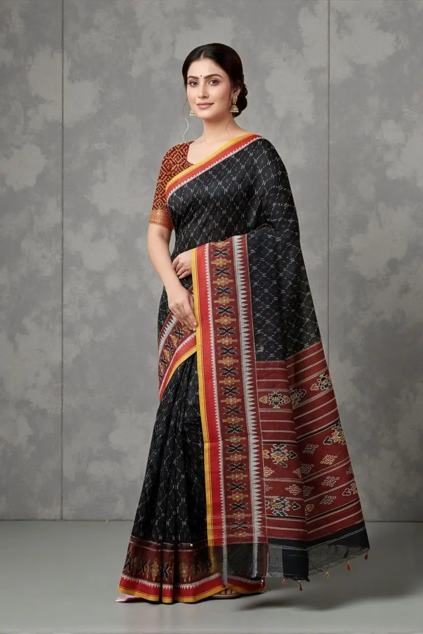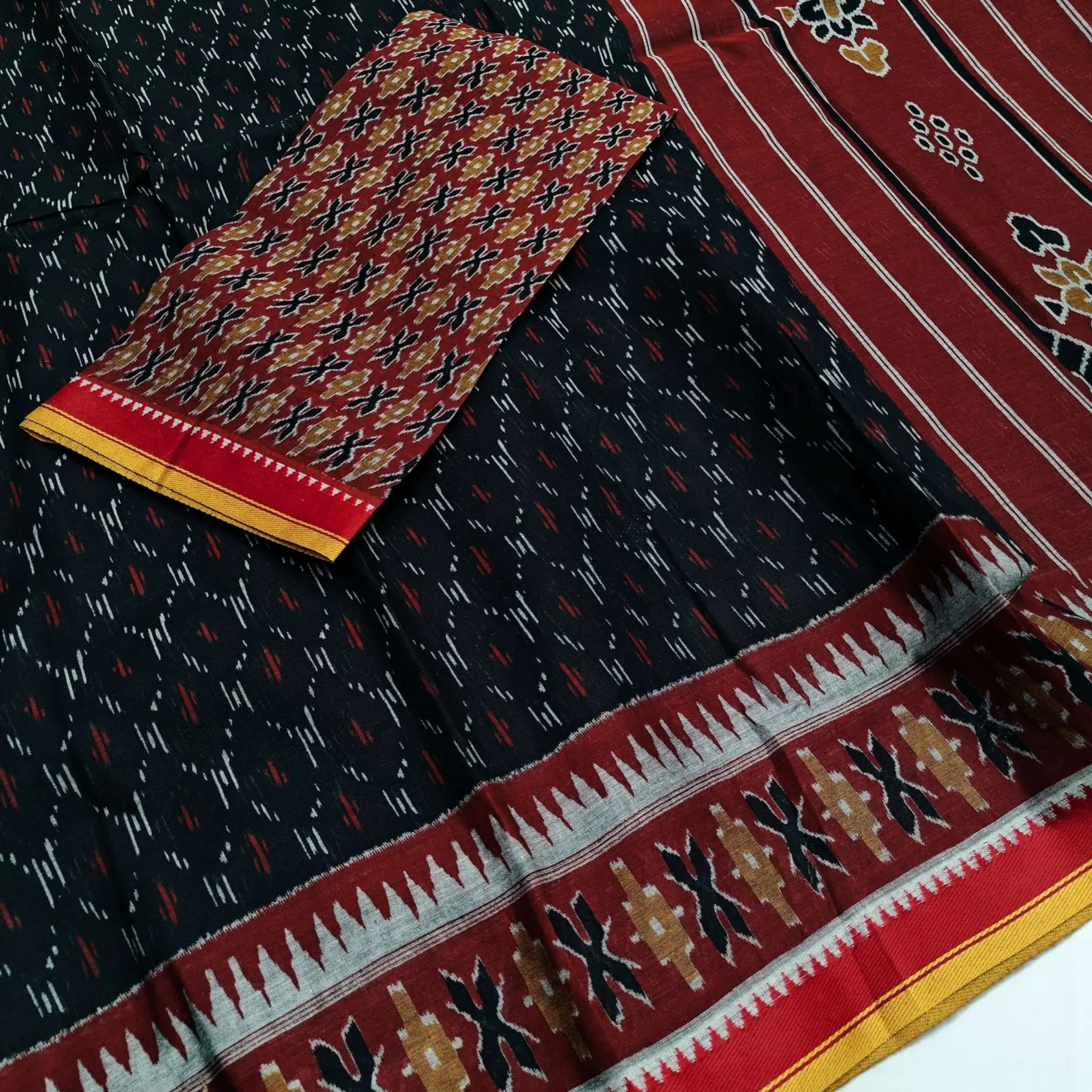 Celebrate the artistry of Odisha with this exquisite Sambalpuri soft cotton saree, thoughtfully crafted using traditional weaving techniques. The deep black body is adorned with delicate woven motifs, creating a subtle textured effect that enhances its visual appeal.