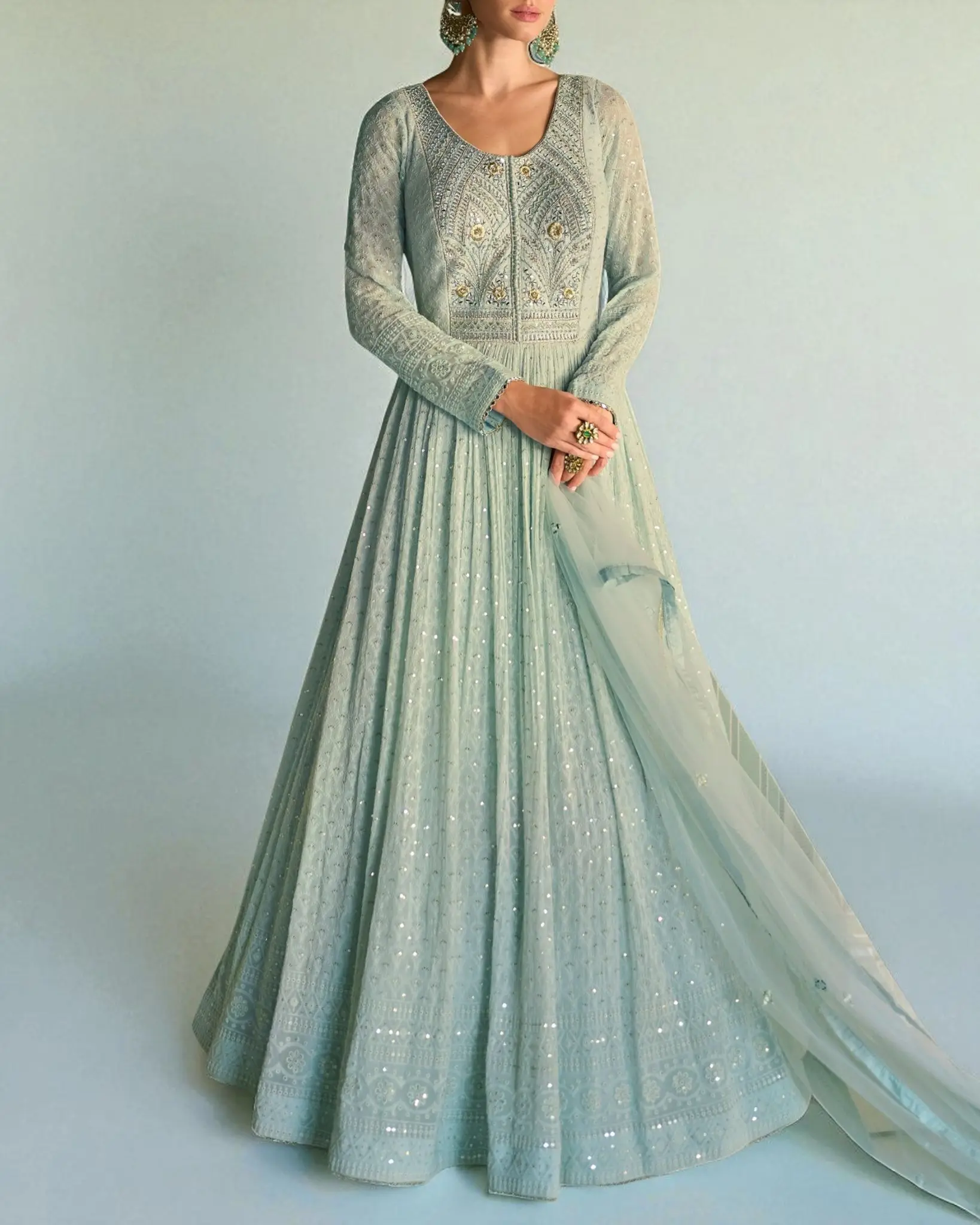 Grace and grandeur come alive in this Misty Aqua Anarkali Gown, crafted with delicate embroidery and subtle sequin highlights.