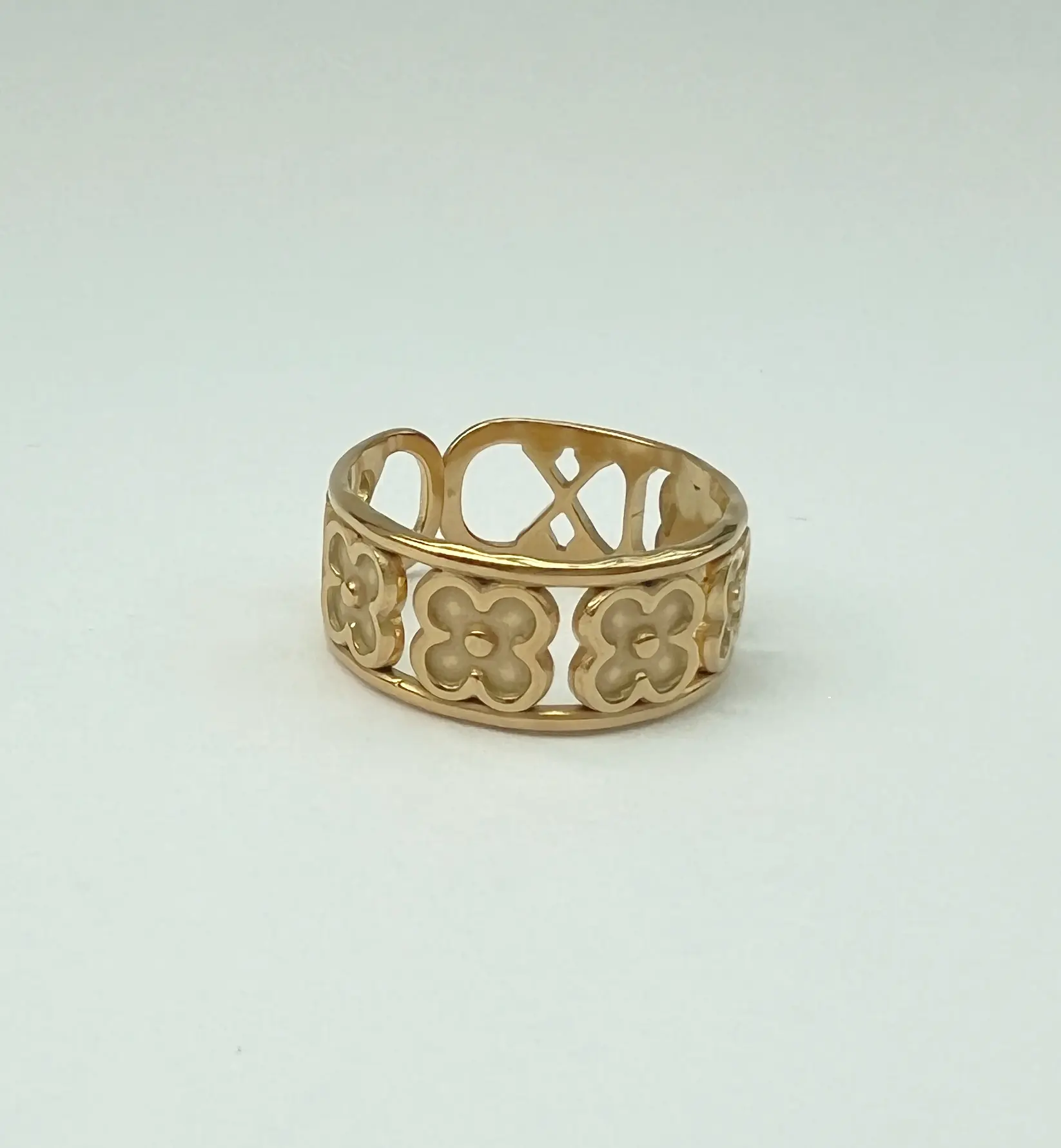 Celebrate elegance inspired by heritage motifs with this ornate lattice band ring. Featuring delicate floral patterns interwoven with openwork detailing, this piece blends traditional artistry with a modern golden finish.The intricate design allows light to pass through softly, creating a graceful interplay of shadow and shine. Perfect for those who appreciate jewellery that carries a sense of story and symbolism, this ring brings an air of cultural charm and refined femininity to any ensemble. A piece to treasure, layer, and wear with intention