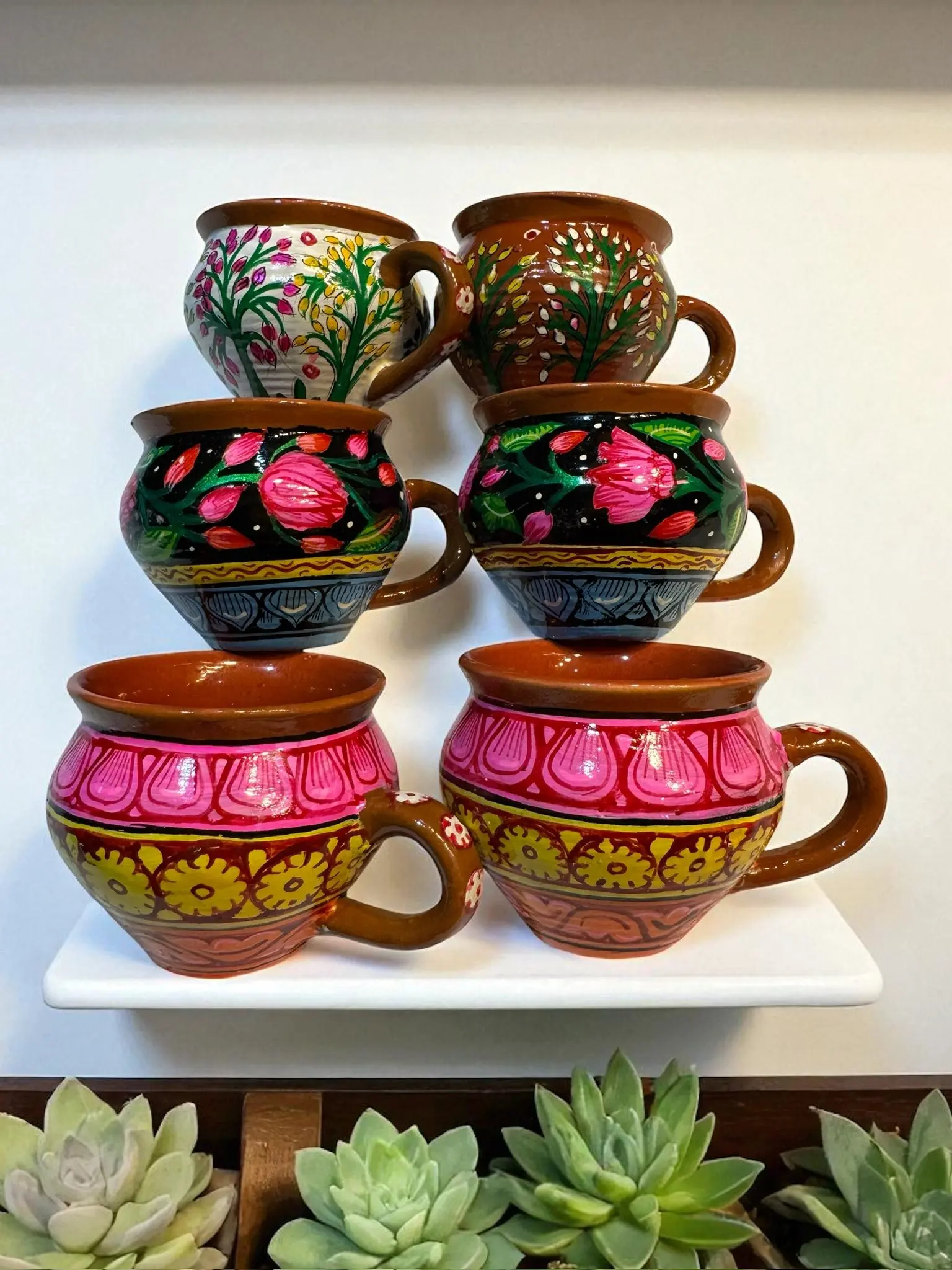 A set of 6 handcrafted clay cups featuring traditional Pattachitra artwork from Odisha, India. Perfect for tea, coffee, or herbal drinks. Each piece is unique, eco-friendly, and?artisan-made.