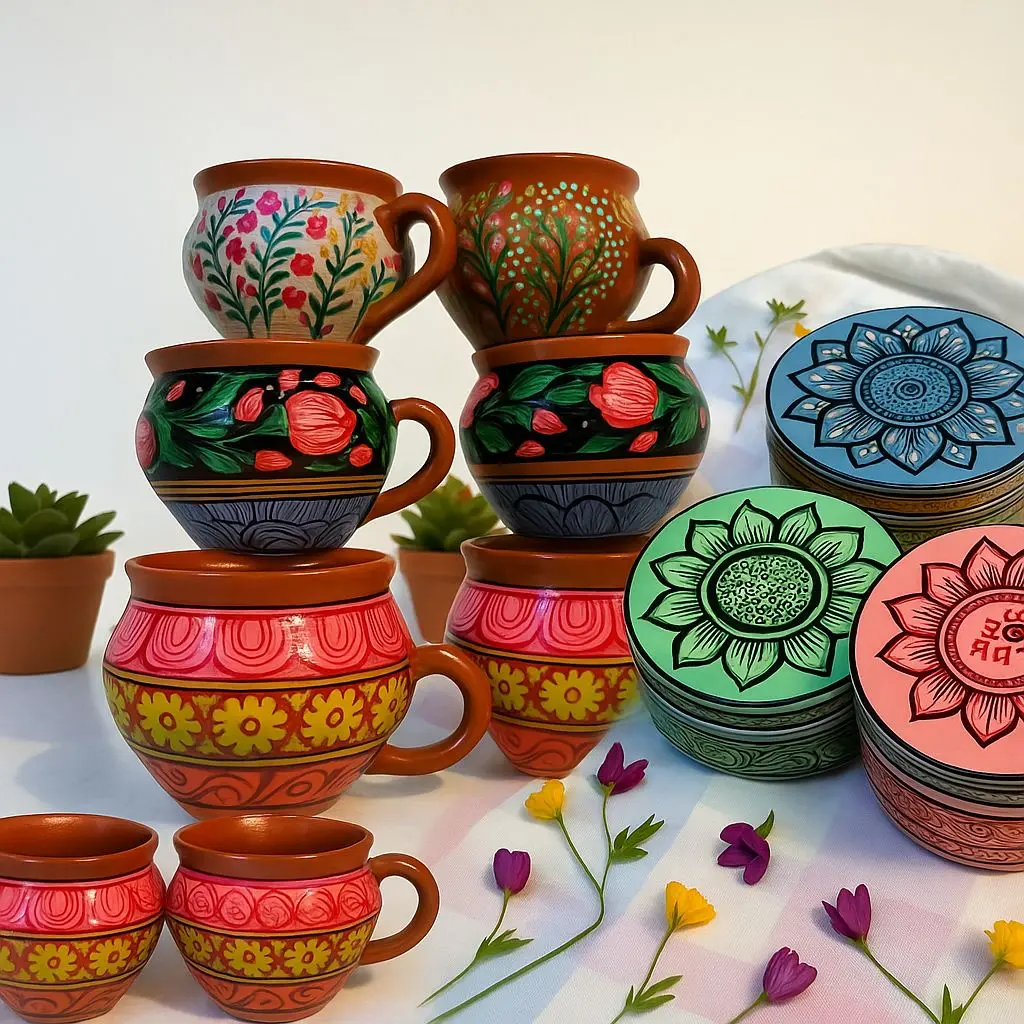 Pattachitra Handcrafted Gift Set ? 6 Clay Cups + 3 Steel Boxes