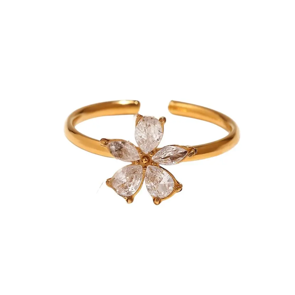 Set on a sleek gold-tone open band, this ring features a radiant five-petal flower design crafted from clear, teardrop-shaped crystals. The minimalist structure allows the shimmering petals to take center stage, catching the light beautifully with every movement. Its adjustable design ensures a comfortable fit for any finger. Perfect for romantic occasions, gifting, or adding a feminine touch to your?everyday?look.