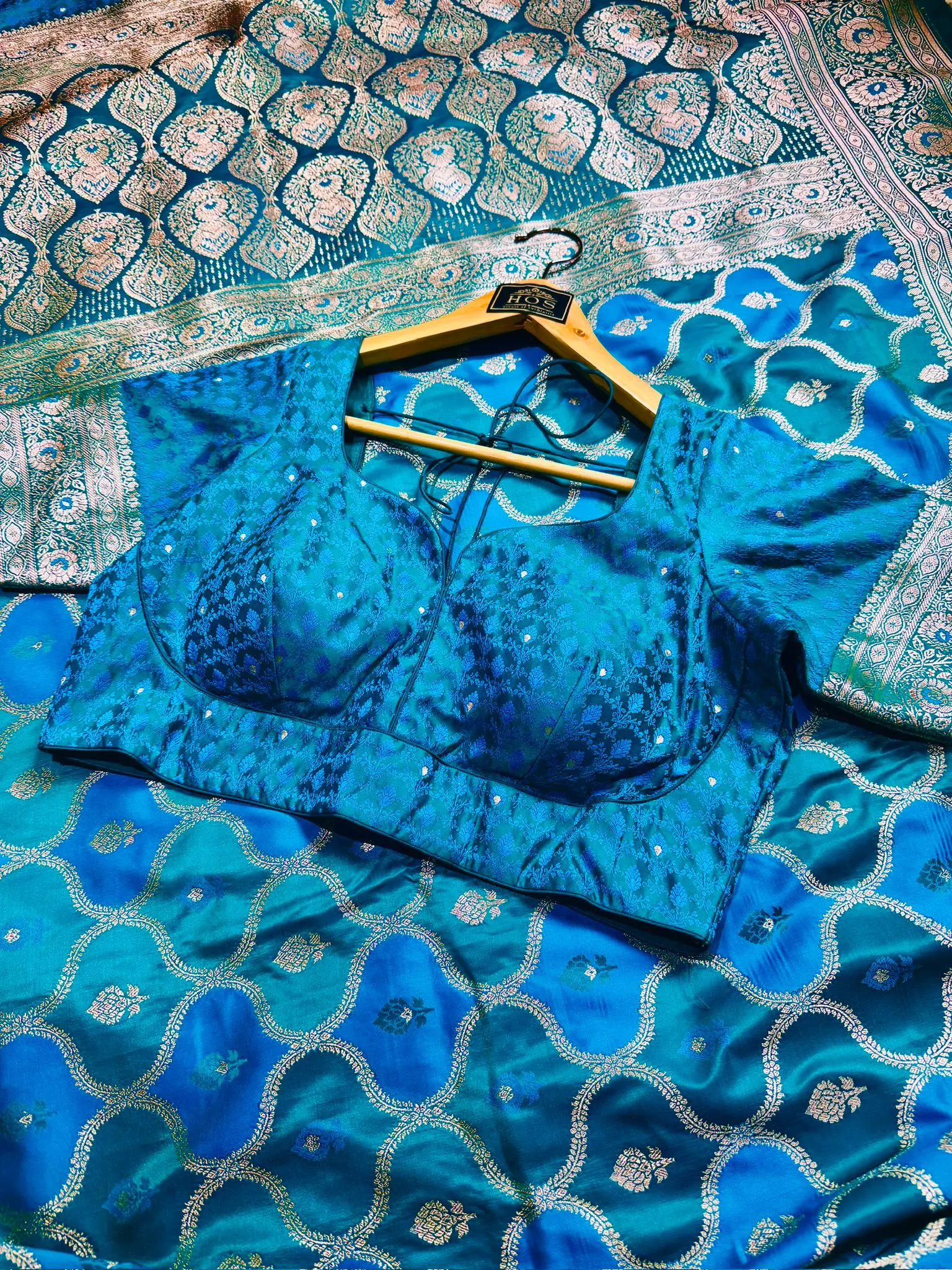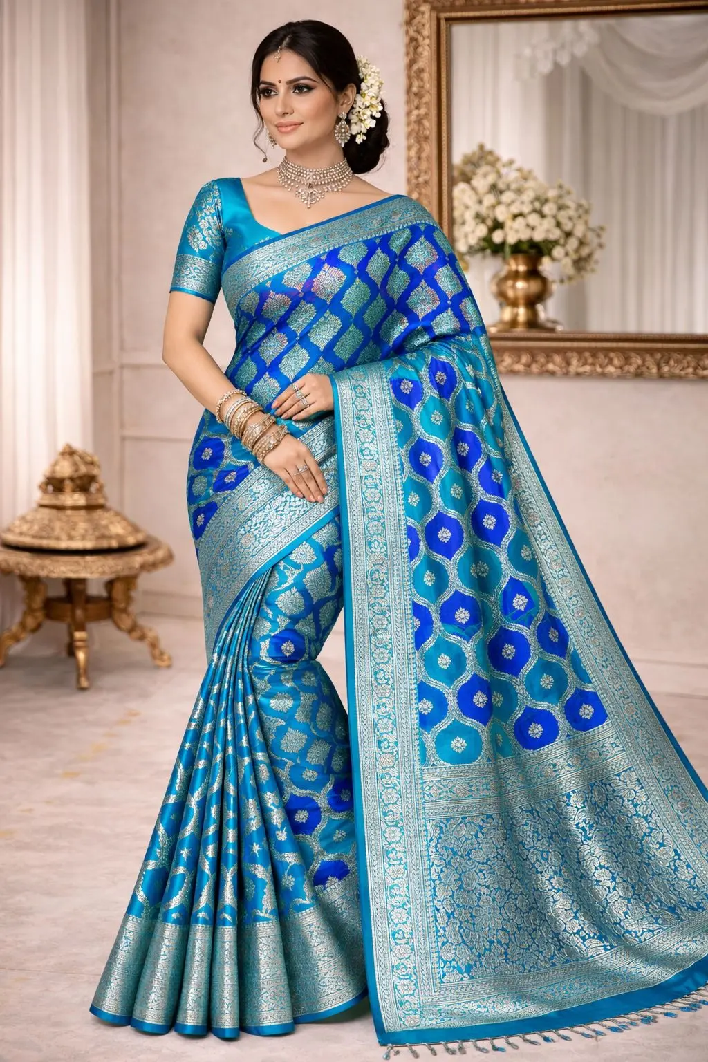 Elevate your ethnic wardrobe with this exquisite Rangkat Pure Banarasi Silk Saree in a stunning cobalt blue and turquoise color palette. Crafted by skilled artisans, this masterpiece reflects the heritage weaving tradition of Banaras, known for its opulent silk texture and intricate zari craftsmanship.