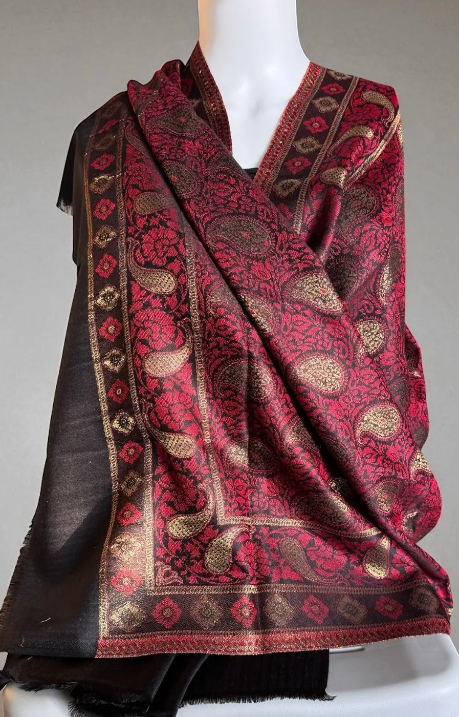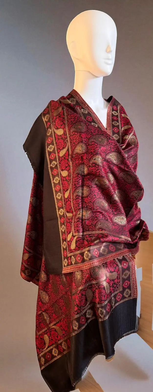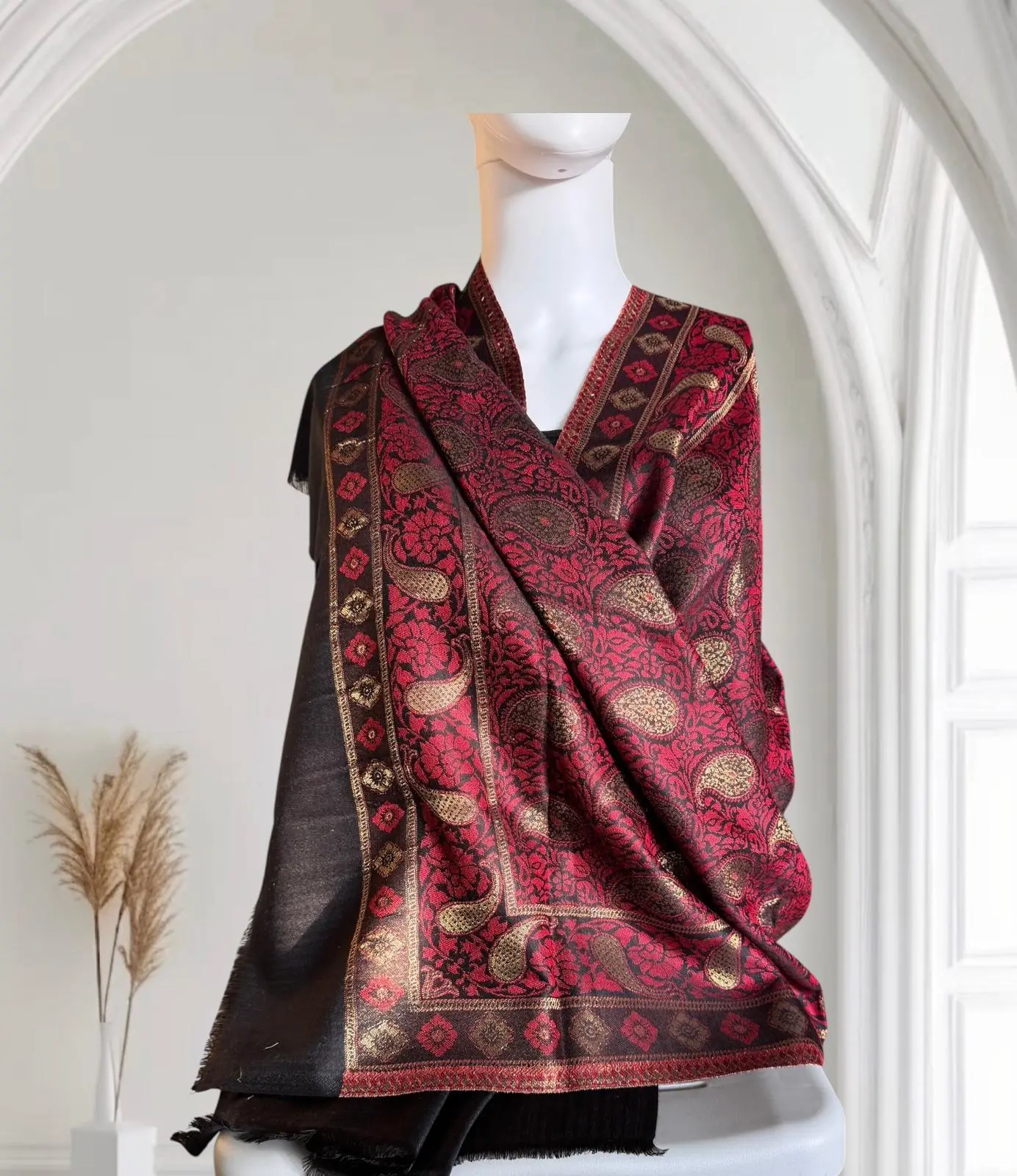 Woven with intricate golden paisley and floral patterns, its deep maroon canvas is gracefully framed by a rich black border.