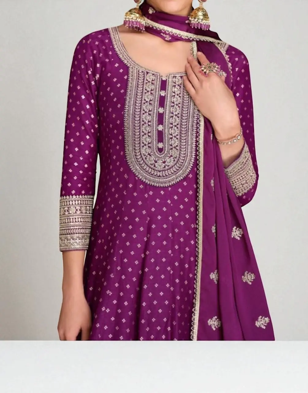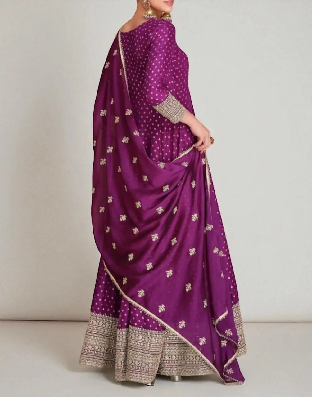 The luxurious fabric is adorned with intricate silver thread embroidery across the neckline, sleeves, and hemline, adding richness to its royal purple base. Paired with a matching embroidered dupatta, this ensemble is designed to make you stand out at weddings, festive celebrations, and special occasions.