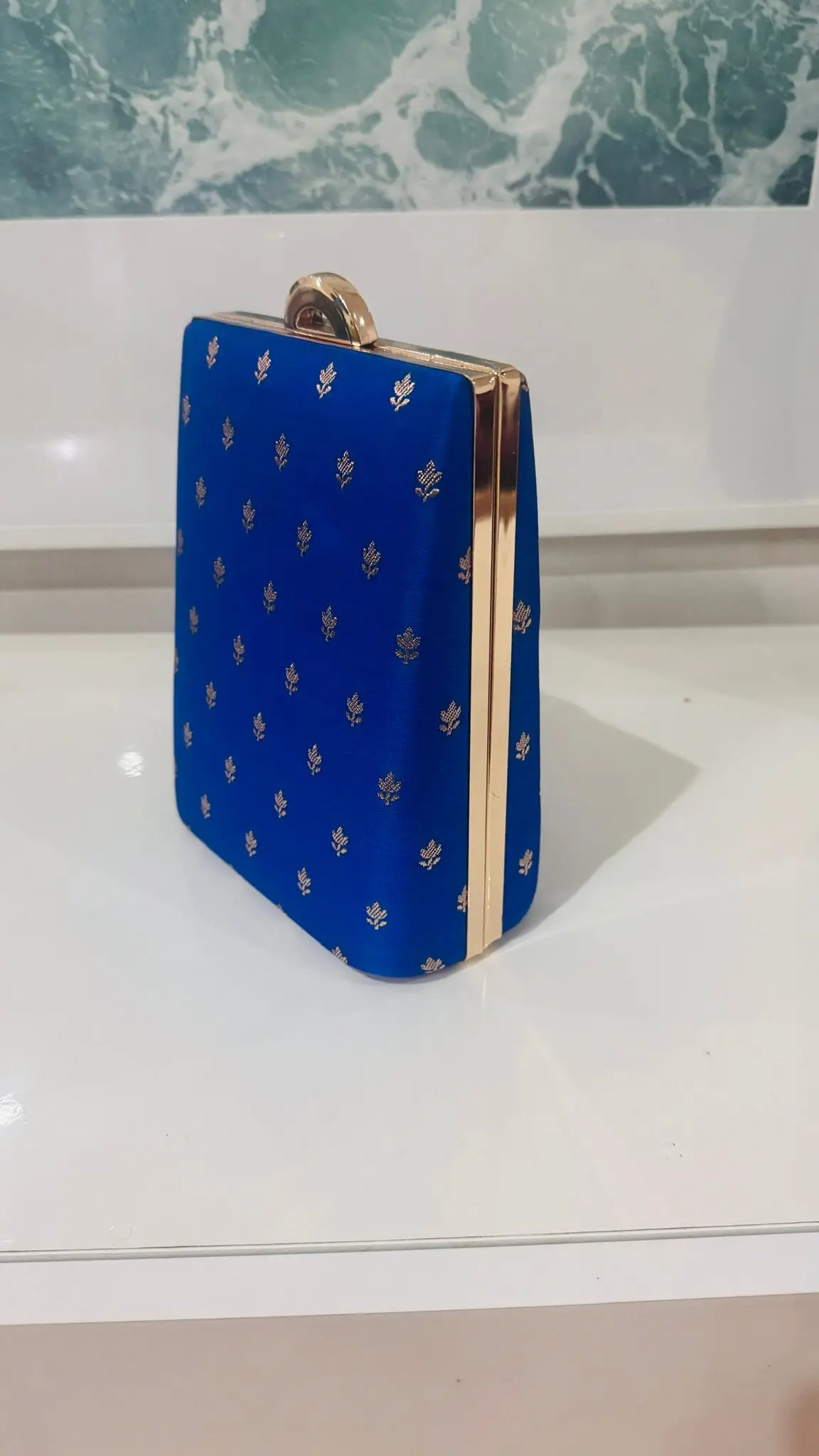 Graceful and timeless, the Sapphire Bloom Silk Clutch is crafted from luxurious pure silk in a deep royal blue hue, delicately adorned with rose-gold floral buti motifs.