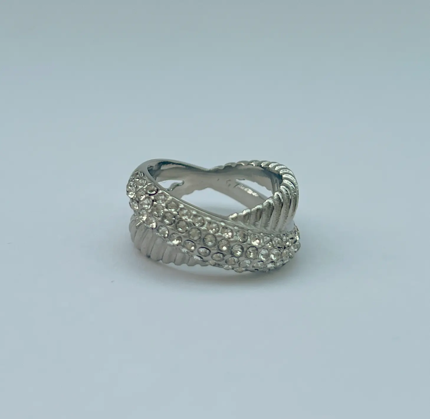 A graceful symbol of unity and elegance, this silver twist ring features a shimmering dual-tone design adorned with luminous crystals. Its gently interlaced form reflects harmony and fluidity, making it a versatile piece that transitions beautifully from day to evening. A refined touch of sparkle for the modern jewellery lover