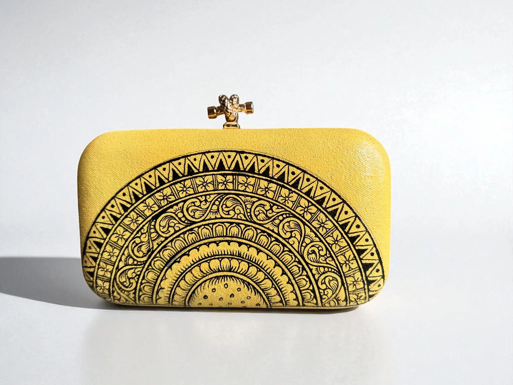 Crafted on a vibrant yellow canvas base, it features intricate black Pattachitra motifs arranged in a mandala-inspired design. The structured rectangular silhouette is complemented by a sleek golden clasp, making it both stylish and functional. Perfect for weddings, festive occasions, or evening gatherings, this clutch is more than an accessory, it is a timeless expression of heritage and contemporary?charm.