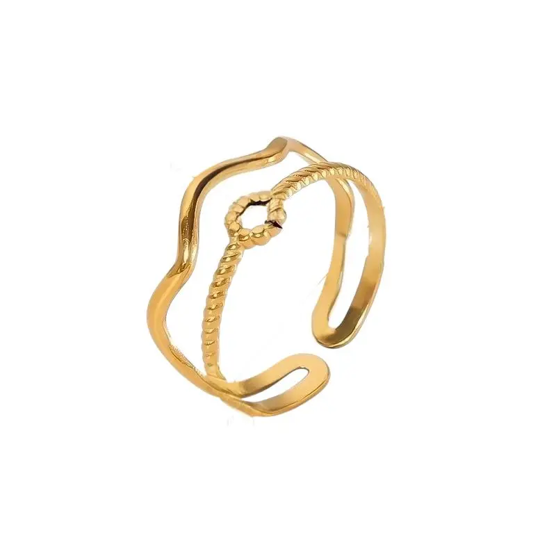 The Golden Twist Knot Adjustable Ring blends contemporary design with delicate detailing. Crafted in a radiant gold-tone finish, it features an open double-band style ? one sleek and wavy, the other textured with a rope-like pattern ? meeting at a charming knot centerpiece. Its adjustable fit ensures comfort and versatility, making it a perfect accessory for both casual elegance and special?occasions.