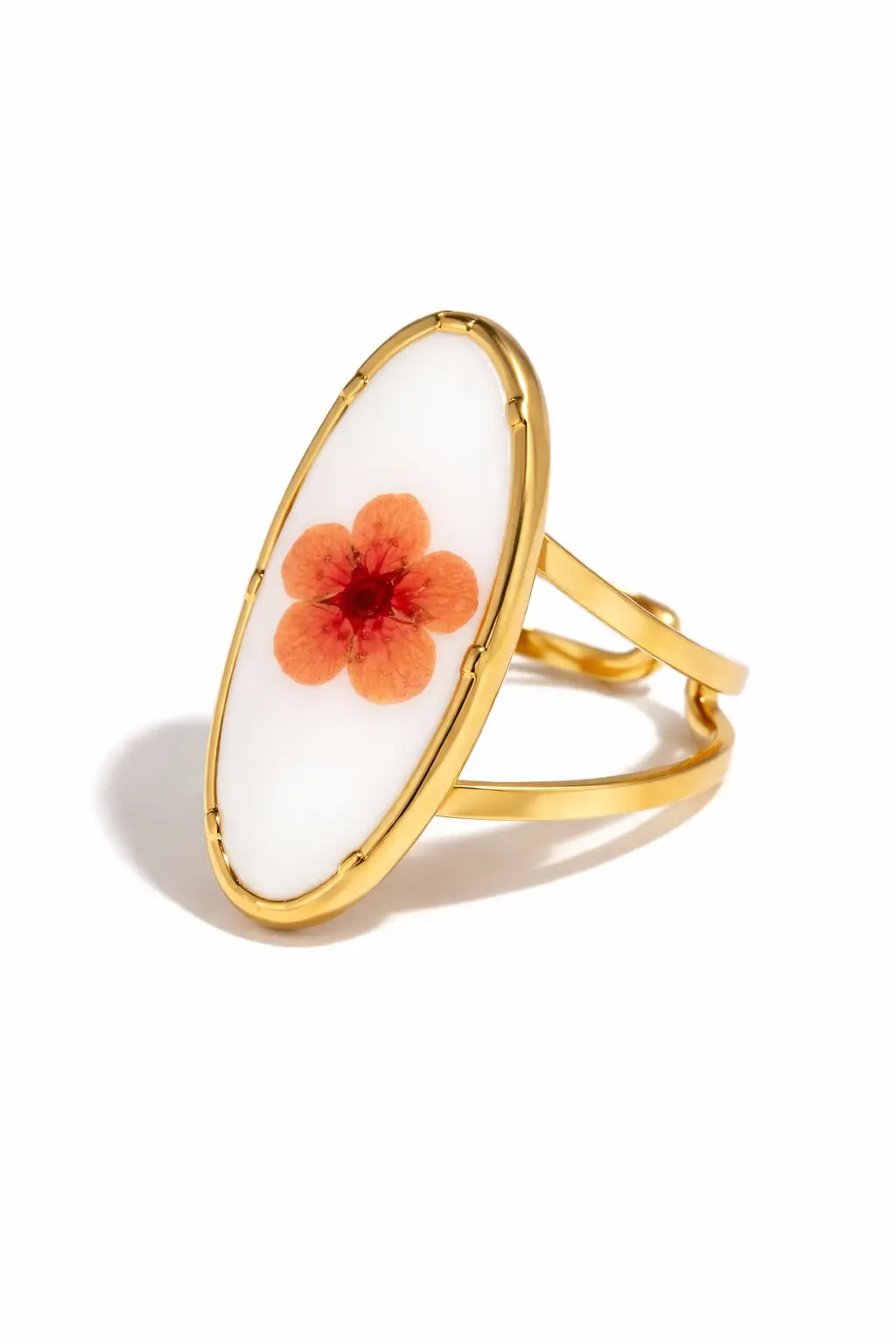 Bring a touch of nature’s grace to your everyday style with this Wildflower Cameo Ring, featuring a delicate marigold-toned floral motif preserved within a smooth oval resin setting. The warm golden frame adds a refined contrast, creating a piece that feels both romantic and timeless.Inspired by heirloom jewellery silhouettes, this ring evokes a sense of nostalgia and quiet elegance. Whether worn as a gentle statement on its own or paired with other pieces, it brings softness and charm to any look. A piece that celebrates simplicity, sentiment, and enduring beauty