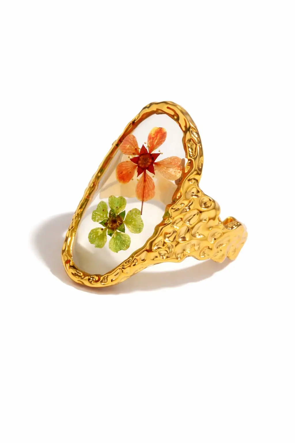 Embrace subtle botanical beauty with this Wildflower Cameo Ring, showcasing a soft meadow-green floral motif framed in polished gold. The elongated oval shape offers a flattering, graceful silhouette while the translucent resin adds depth and gentle luminosity.Rooted in the elegance of vintage cameo jewellery, this ring brings a touch of nature’s calm into modern styling. Light, feminine, and effortlessly wearable, it is perfect for those who admire detail without excess. A quiet ode to growth, renewal, and natural charm
